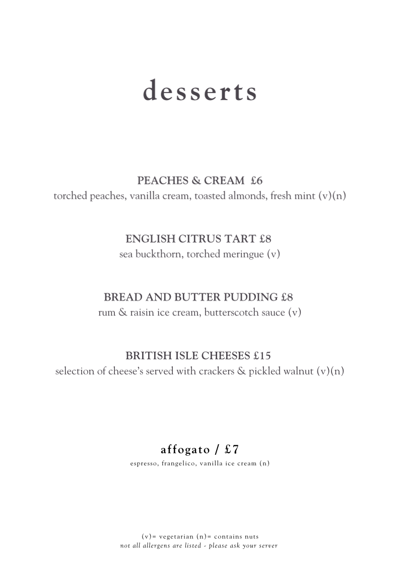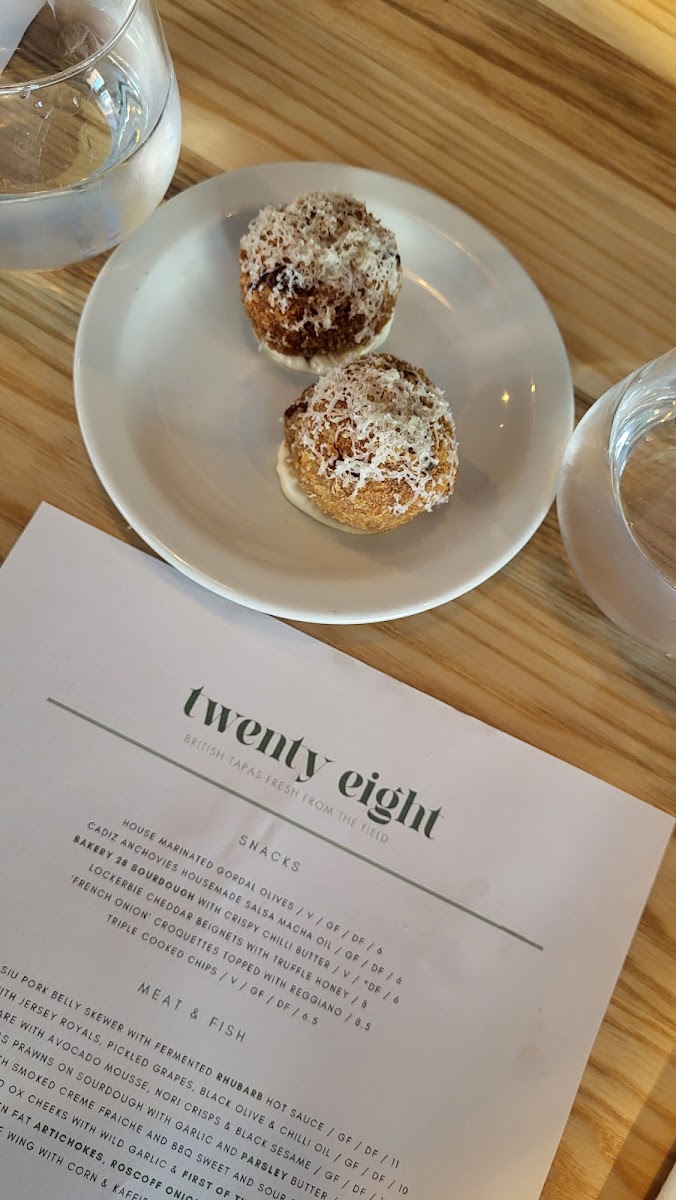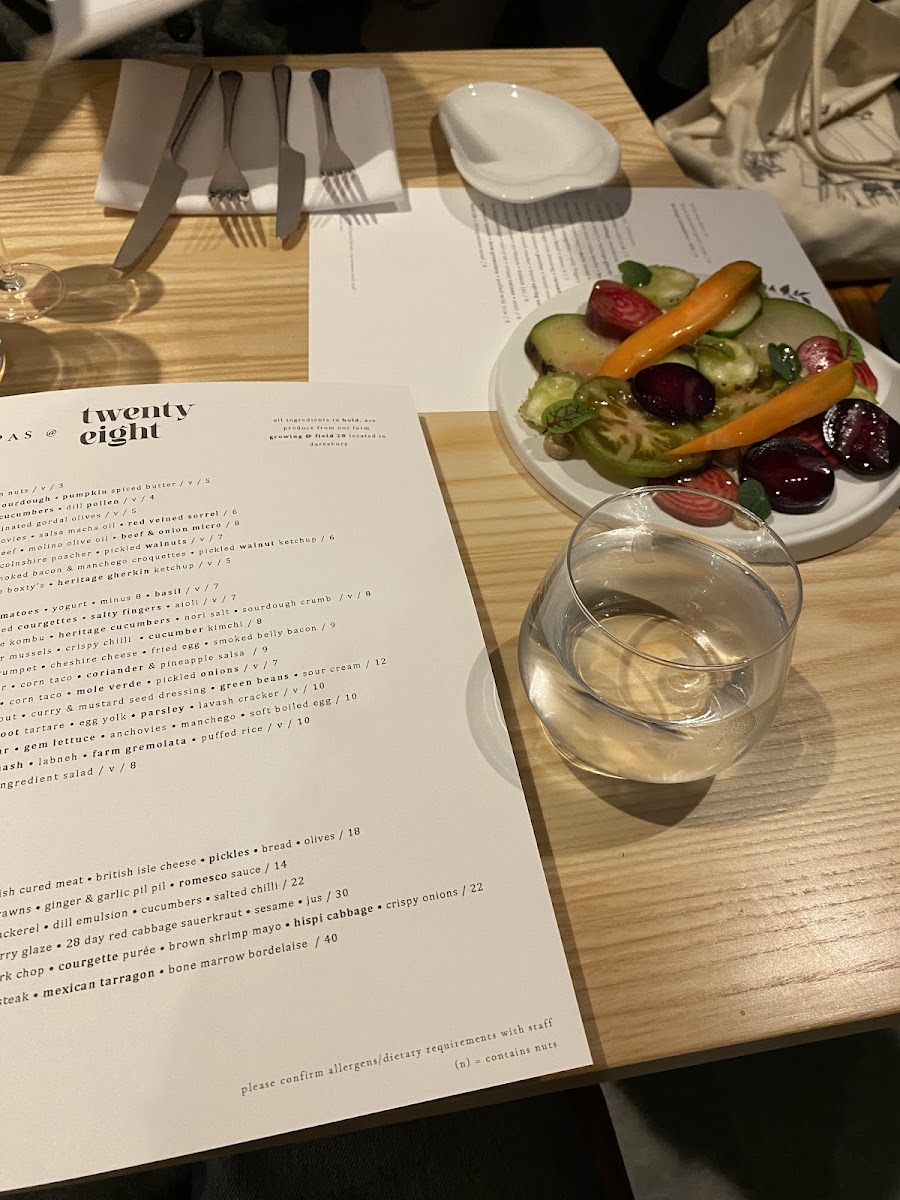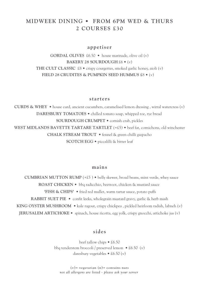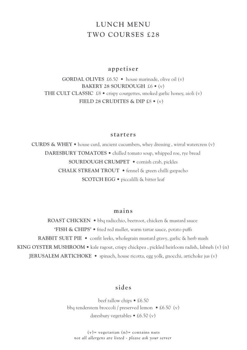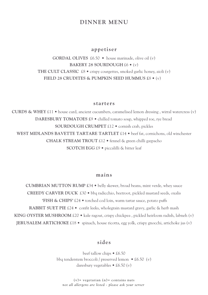 From a reviewer’s perspective, the menu at Twenty Eight offers a thoughtfully curated selection that balances simplicity with refinement, even without listed prices. The appetisers, including Gordal Olives, Bakery 28 Sourdough, and Field 28 Crudites & Pumpkin Seed Hummus, set a fresh and artisanal tone, while starters such as Curds & Whey, Daresbury Tomatoes, Sourdough Crumpet, West Midlands Bavette Tartare Tartlet, and Chalk Stream Trout showcase regional ingredients with creative flair. The mains are particularly compelling, with standout dishes like Cumbrian Mutton Rump, Creedy Carver Duck, Fish & Chips, Rabbit Suet Pie, and King Oyster Mushroom, catering to both traditional and modern tastes. Accompaniments such as Beef Tallow Chips, BBQ Tenderstem Broccoli / Preserved Lemon, and Daresbury Vegetables complement the mains nicely, while desserts including Peaches & Cream, English Citrus Tart, Bread And Butter Pudding, British Isle Cheeses, and Affogato provide a satisfying and classic finish. Overall, the menu feels cohesive and ingredient-driven, leaving a strong impression despite the absence of visible pricing.